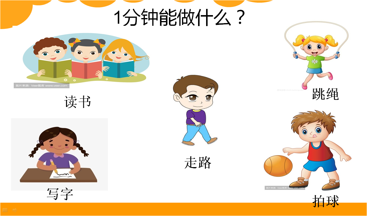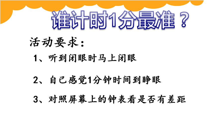 我们在王智明教授的文章中曾看到 “度量性概念是基于任务产生的,学生在一定的任务情境中,通过比,利用人类的心智活动产生的度量性概念。” 那么在我们的教学中,不一定非得通过 “闭眼” 活动来感受 1 分钟的时长,我们会根据学生的实际情况,在教学中通过多个活动来进行。