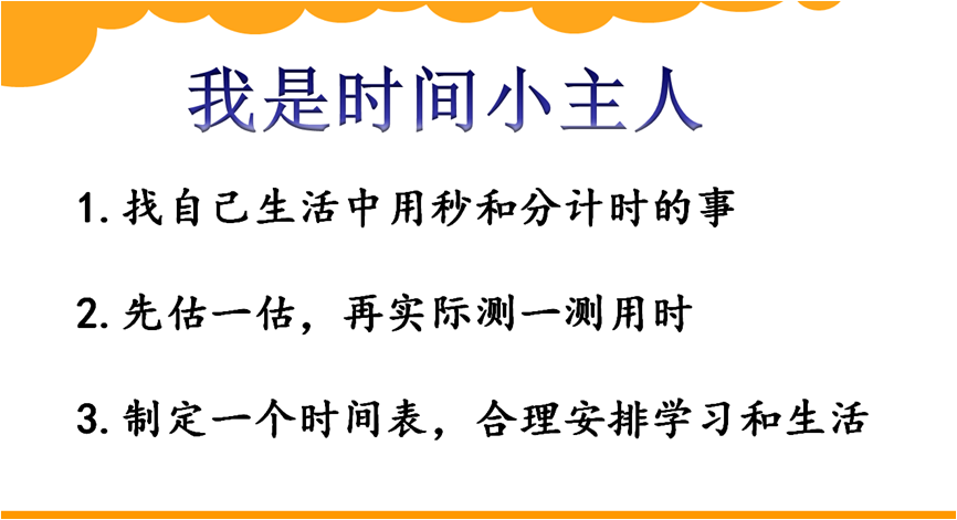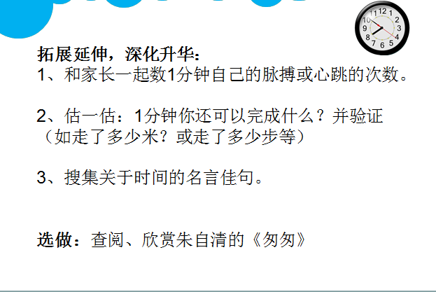 我们这两次 “1 分有多长” 的体验感受,第一次是为了让学生发现分与秒之间的关系,知道 1 分 = 60 秒。第二次目的是为了让学生用 “1 秒” 来度量 1 分的时长,经历时间单位的累加过程,并通过体验活动丰富学生对 “1 分有多长” 的多样化感受。