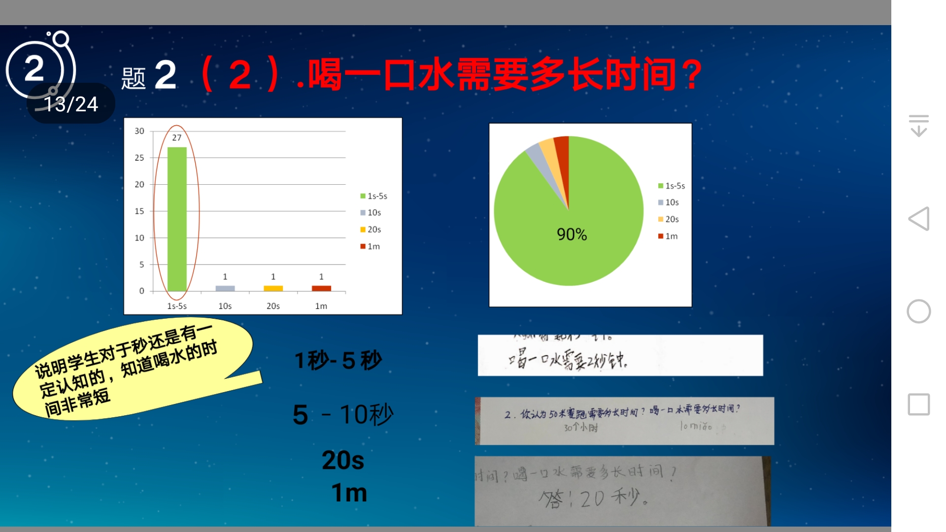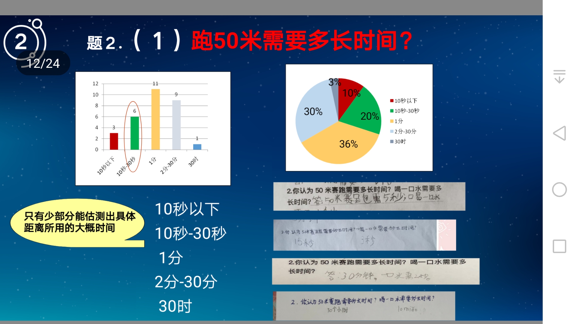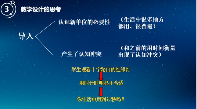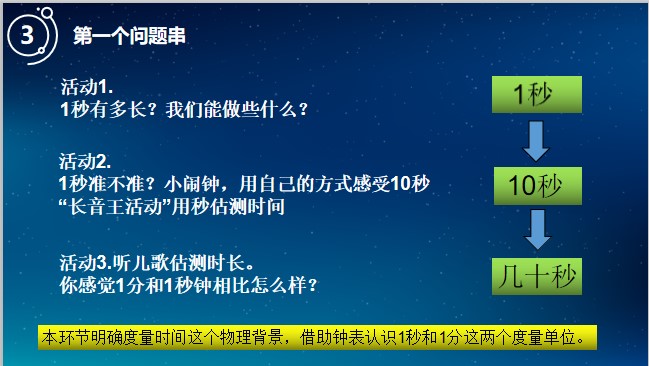 在研究中发现,做时间估测,如果给些混淆背景,如:悦耳声音、有趣动画,等等,学生就不能准确估测了,即使很短的 “1 分”。因此,在问题串 4 的教学中我们着重在 “用秒来计量”,鼓励计量方法多样。这也凸显了本节课的 “度量” 主题。