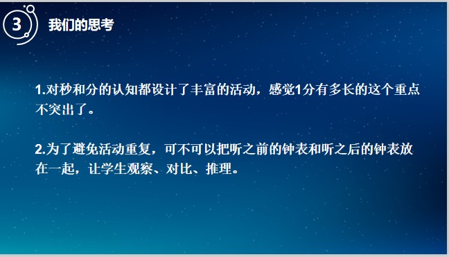 我们的教材很注重 “学生的共识” 和 “经验的拿来”,使学生建立起对 “1 秒”“1 分” 有多长的认识,你们的问题也说了教师用书中是建议两次 “闭眼感受 1 分钟” 这样的活动,我们组织的活动也是和此有同样的目的意义,使学生深层次的感知。下面请我们的执教教师谈一谈: