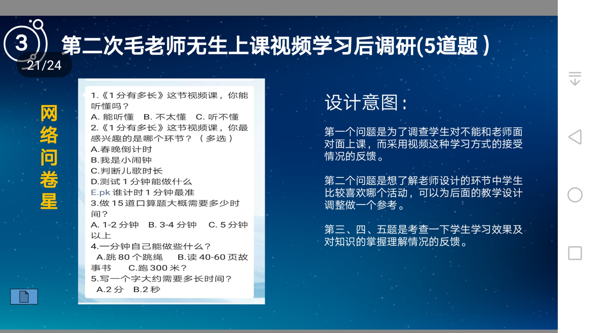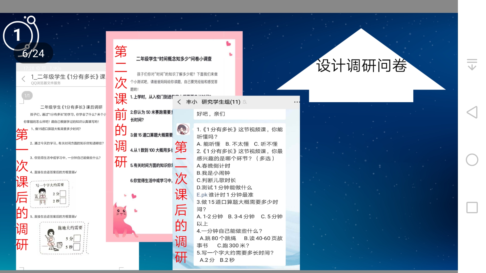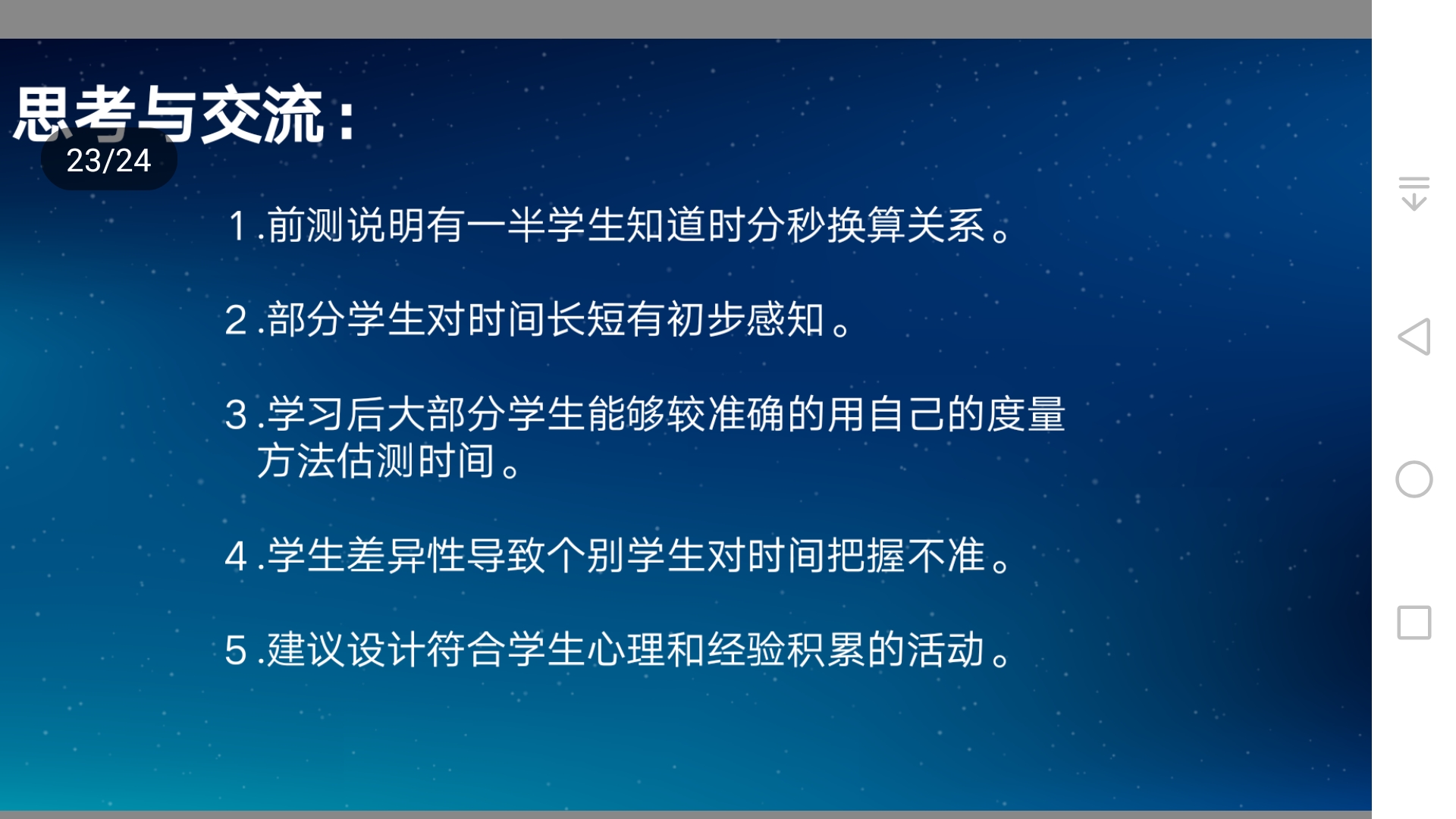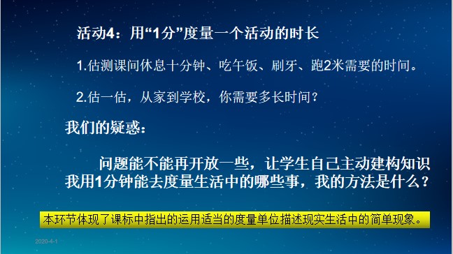 虽然我们没有让学生来两次体验闭眼 1 分钟的活动,但是我们之前有一个听儿歌的活动,这个过程中,学生没有用眼睛看,也是一个对时间感悟的过程。这样就达成了对时间的深层次感知。