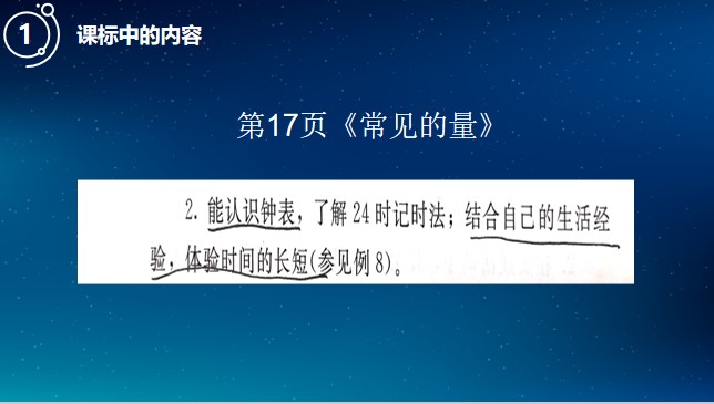 认识时间是学生日常生活以及小学数学教材当中一个非常重要的内容,旨在能认识钟表,了解 24 时计时法;结合自己的生活经验,体验时间的长短,帮助学生建立时间观念。