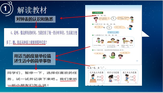 综上所述,《1 分有多长》一课,无论是从教材的编排,还是本节课的内容设置,都充分体现了本节课在学生度量方面发展的重要作用。结合本次活动的主题 “度量”,我认为《1 分有多长》一课是极佳的研讨载体。