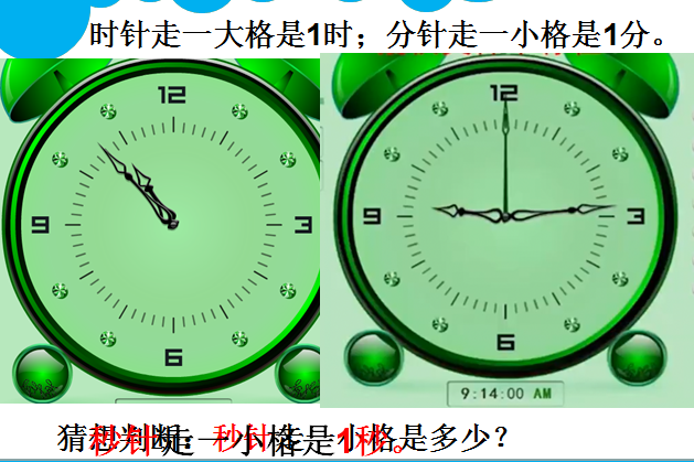 问题串 1(如下图)“看一看,说一说”:主要让学生认识秒。
