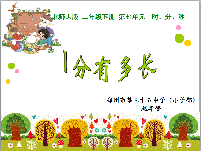 《1 分有多长(认识秒)》是北师大版小学数学二年级下册第七单元《时、分、秒》的第二课时。本课时的学习内容是:认识秒、知道 1 分 = 60 秒、体验时间的长短。本课时的内容共有四个问题串: