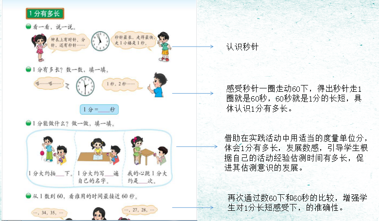 北师版教材的设计也突出体现了这点。在二下第七单元《1 分有多长》这一课的教学中,教材呈现了四个问题,完整的体现了这一过程:首先,借助钟表的情景调动学生已有的生活经验,认识秒针,知道比分更短的时间单位秒。接着,在数秒的活动中,建立 “1 秒” 长短的表象从而认识 1 分,知道秒与分之间的关系,进而形成 “1 分” 长短的时间观念。从而,借助 1 分感知、体验、估计生活中 1 分能做什么?从而培养学生的数感,积累丰富的活动经验,培养学生的时间观念。