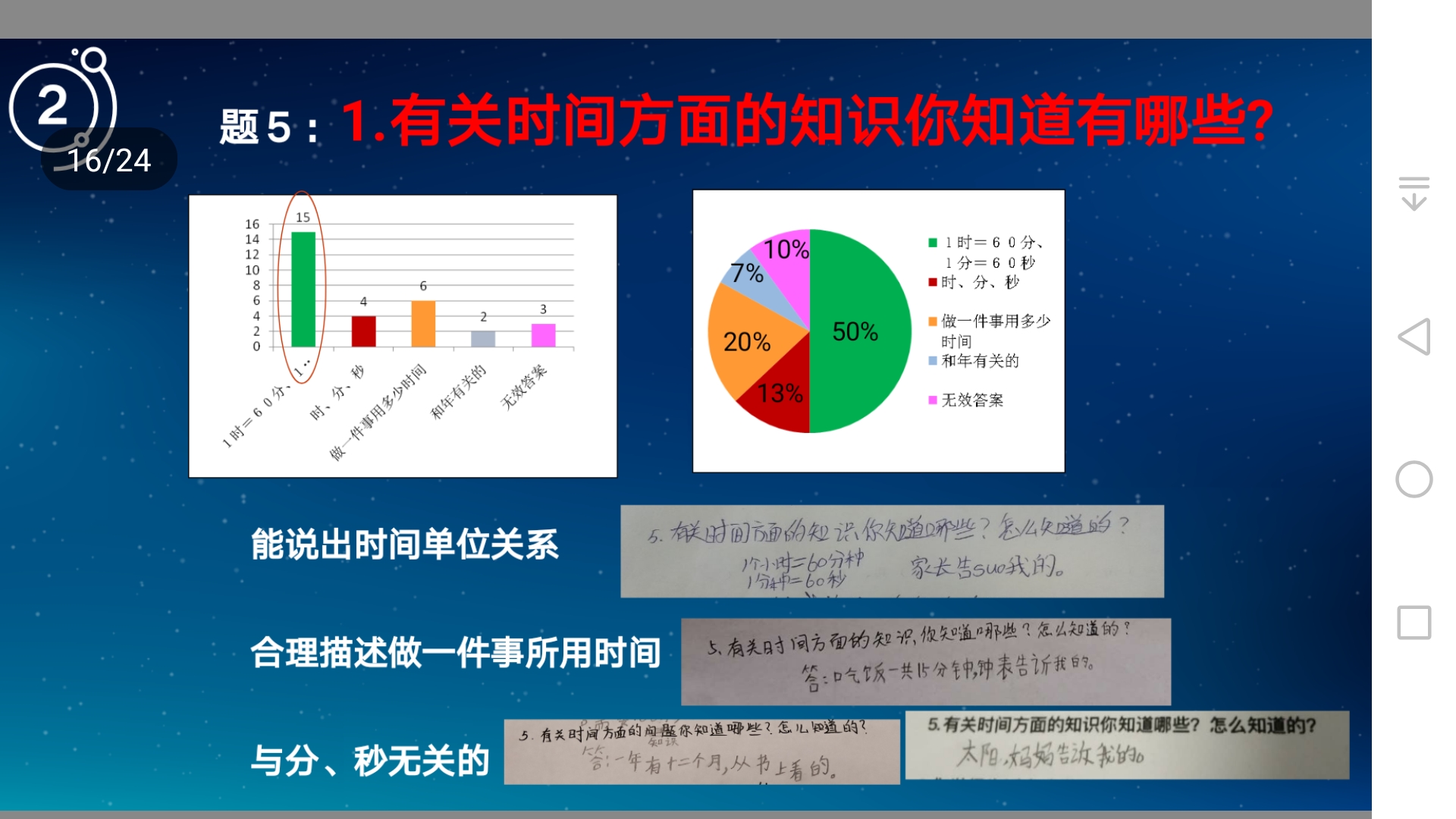 50%的学生知道时、分、秒之间的关系,40%的学生知道且能描述相关信息,10%不知道空白没写。