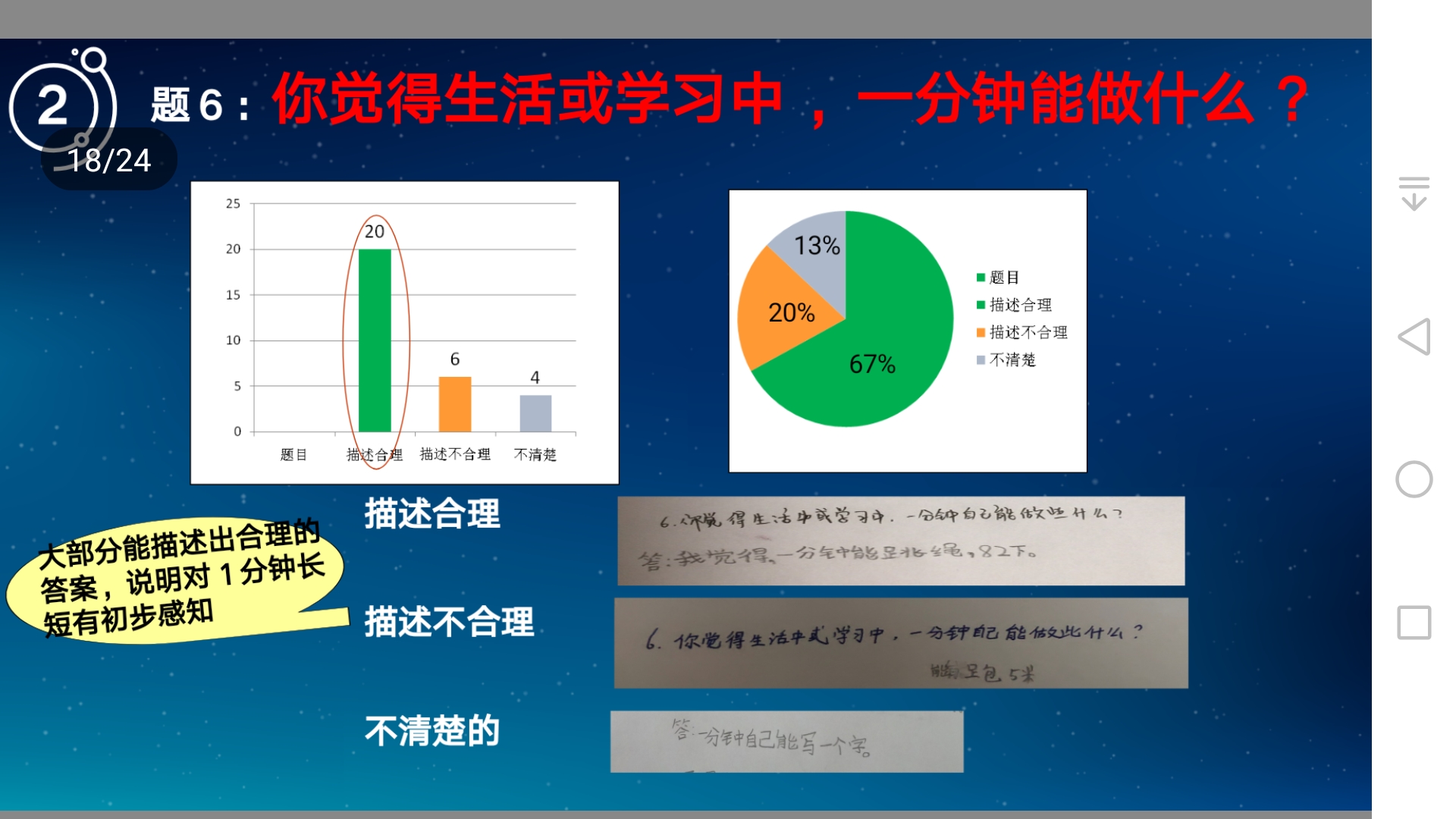 总之,我们尊重教材,用好教材,根据学生学习实际、根据度量的解读与研究,适度的改进教与学的过程,这就是我们在建立 “1 分” 概念时的具体做法。