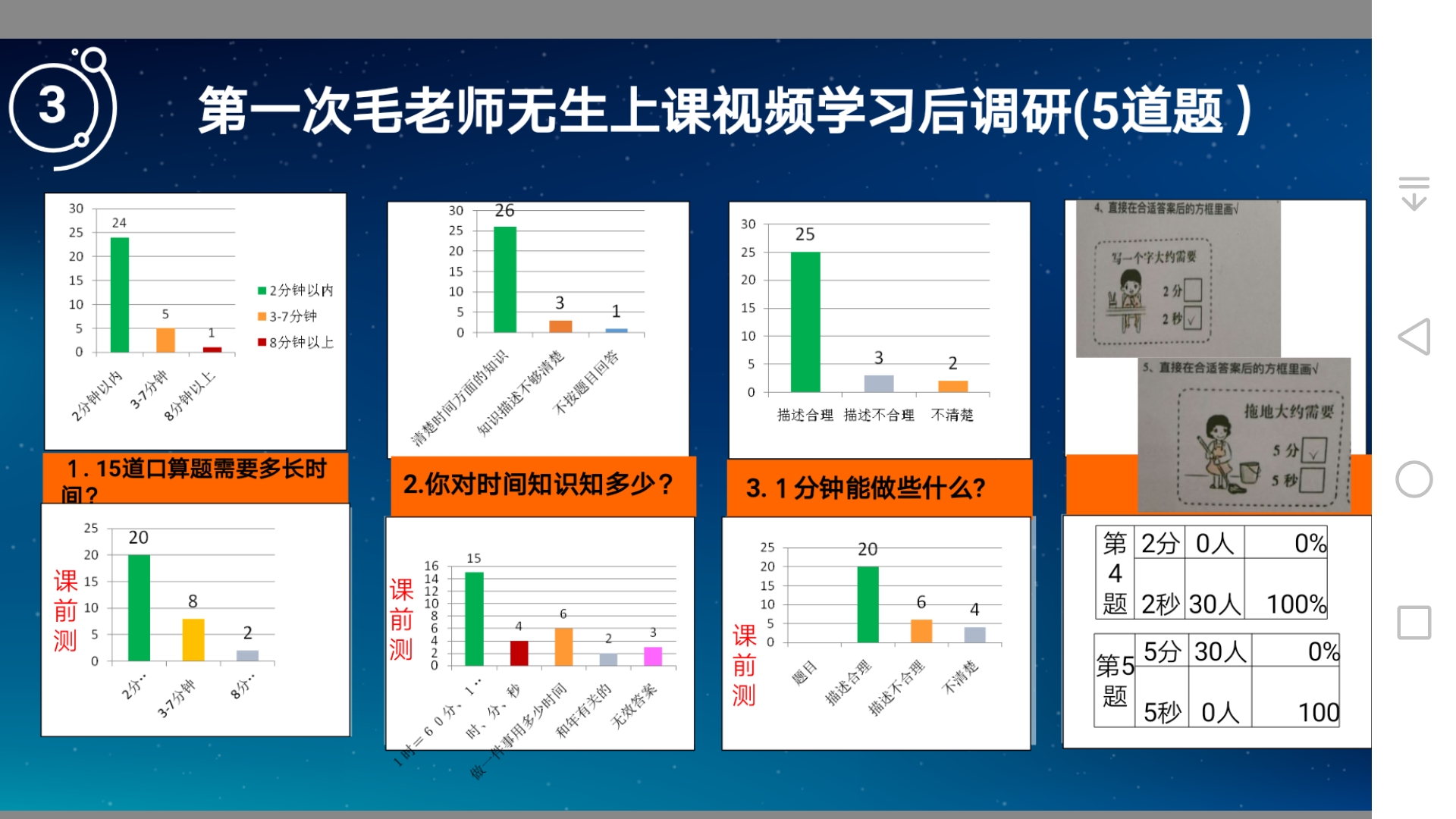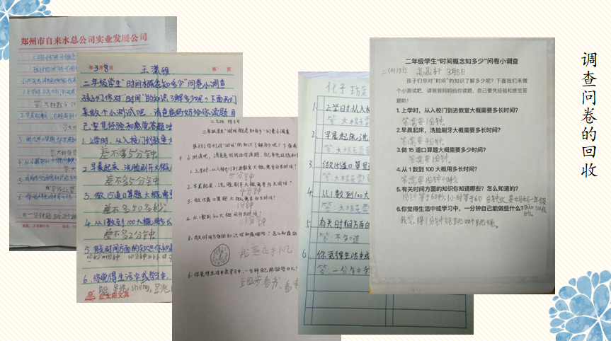 为了准确把握学生的学习起点,了解学生对 “时间” 的直观感受情况,我们设计了如下调查问卷并对学生进行了课前调查。(如下图)。