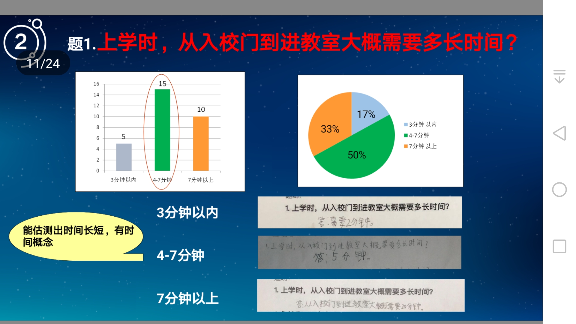 部分学生认为在 3 分钟以内,如:1 分钟,时间过短,占半数的学生描述时间在 4-7 分钟,符合实际(有一定的感觉),少部分学生估计在 7 分钟以上,时间过长。