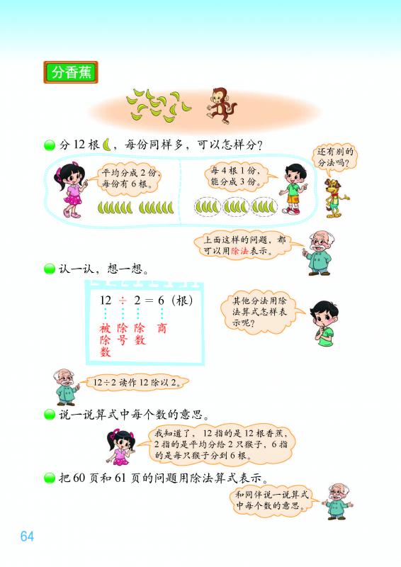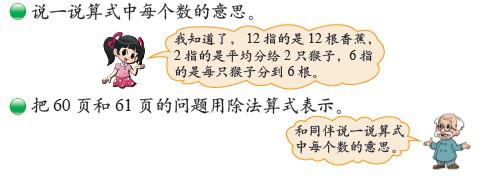 师:通过分香蕉,我们得到了新的除法算式,那关于除法算式,这里还有一些小知识就藏在书中 64 页里,需要你来了解一下,请你仔细读一读,看一看你有什么收获?(引导学生自学)