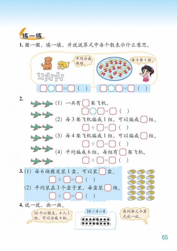2. 综合练习:65 页第 2 题看图列两个算式。先说图意,再写出除法算式,小组对照交流。第 3 题,让学生同桌合作填一填。