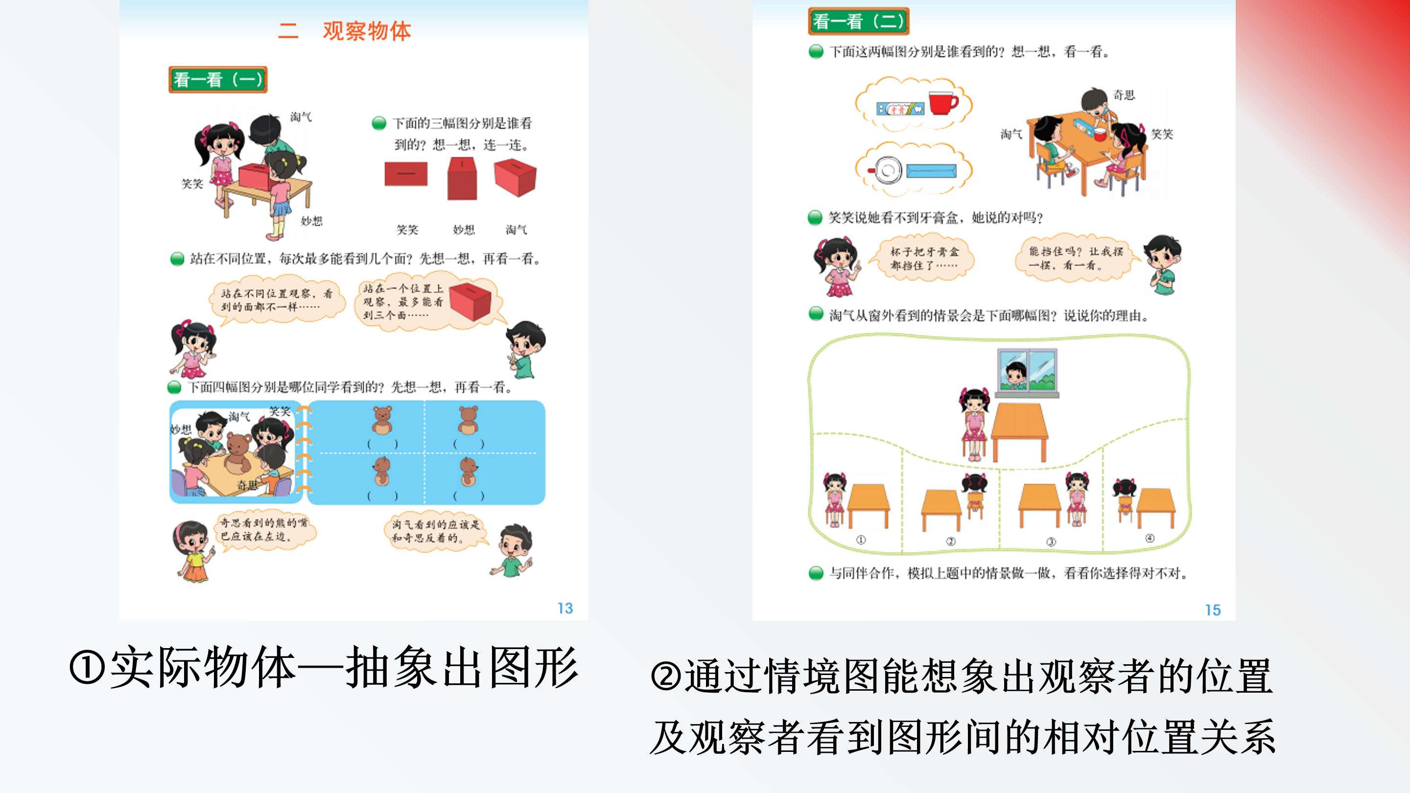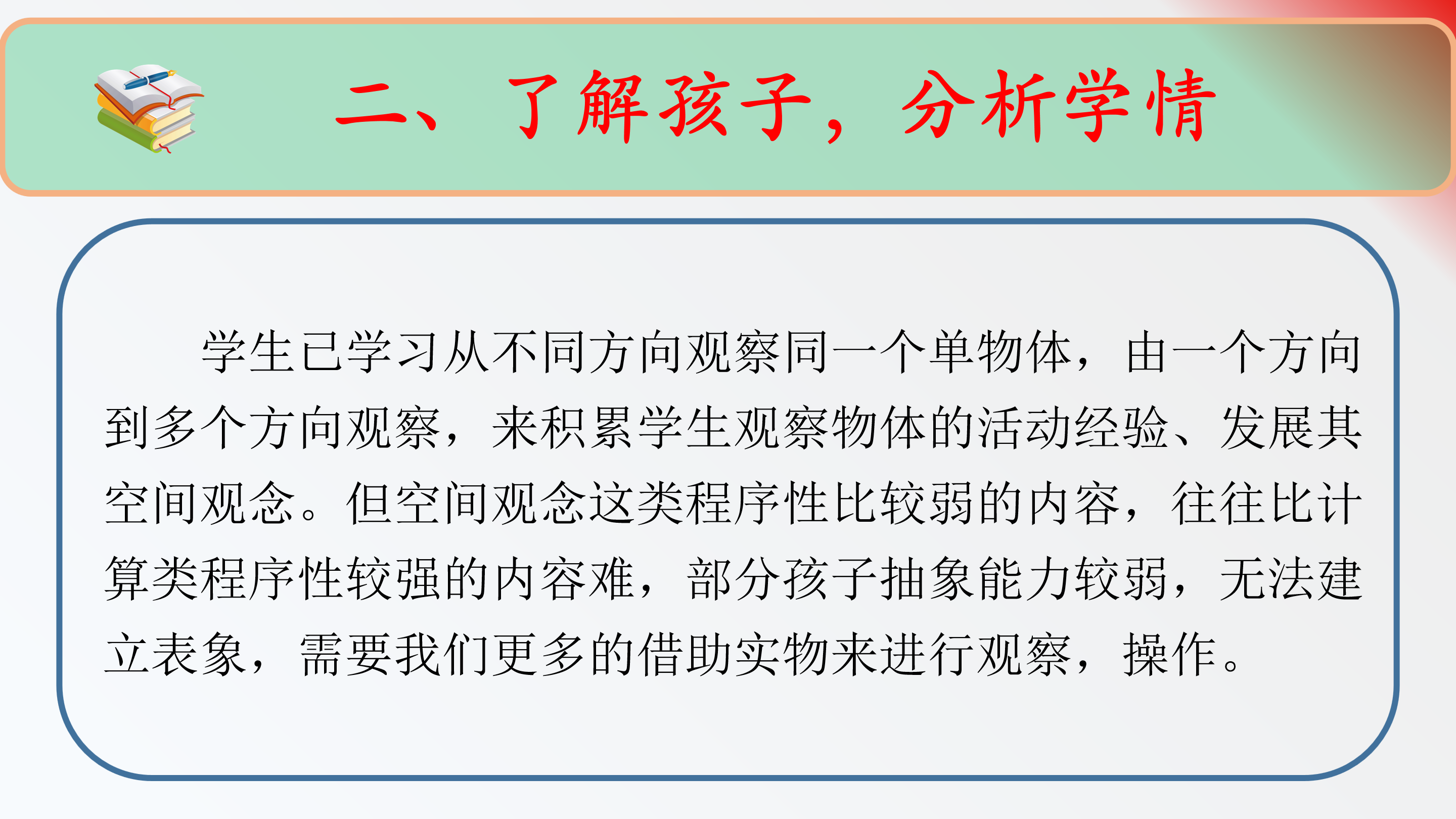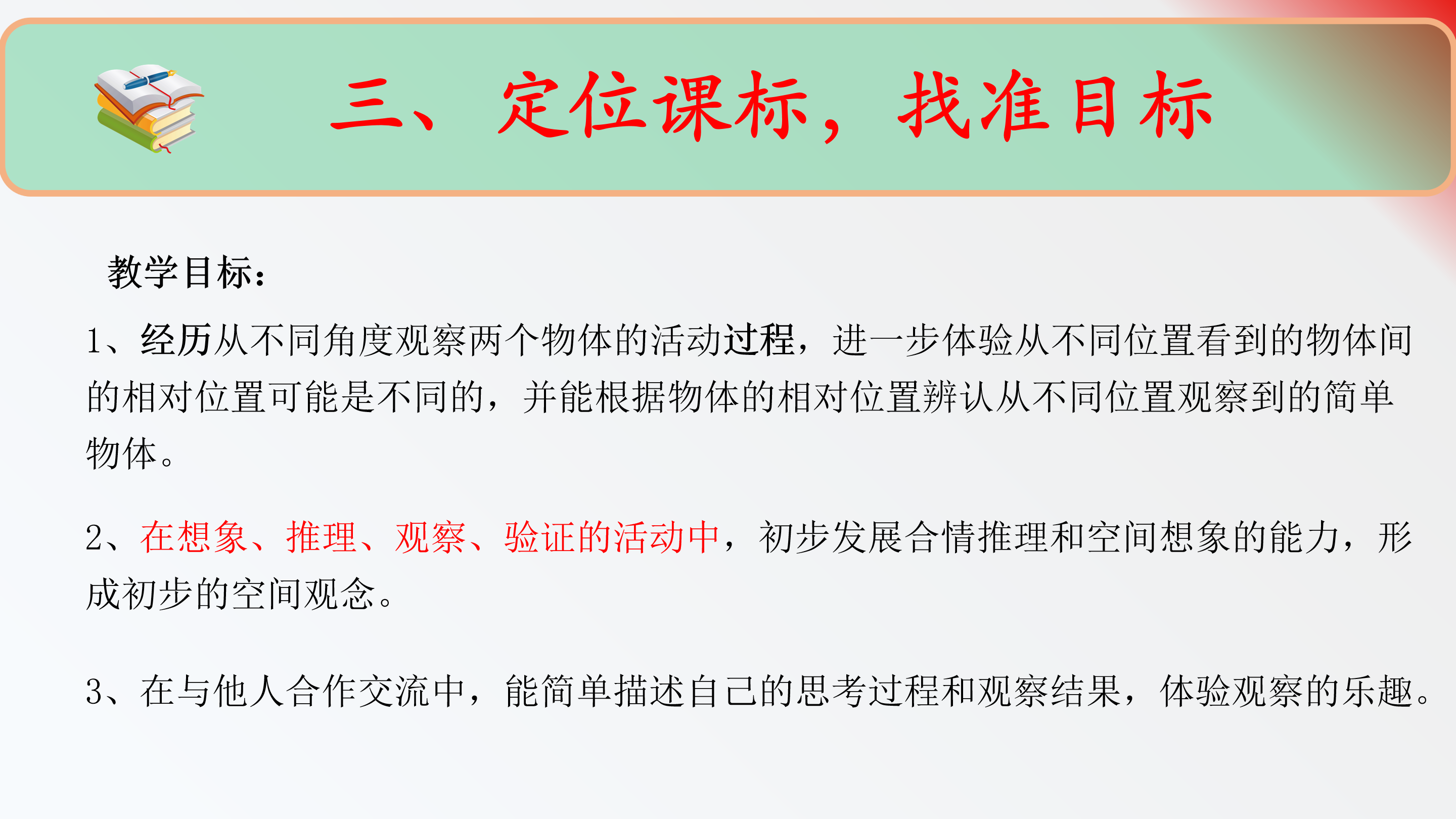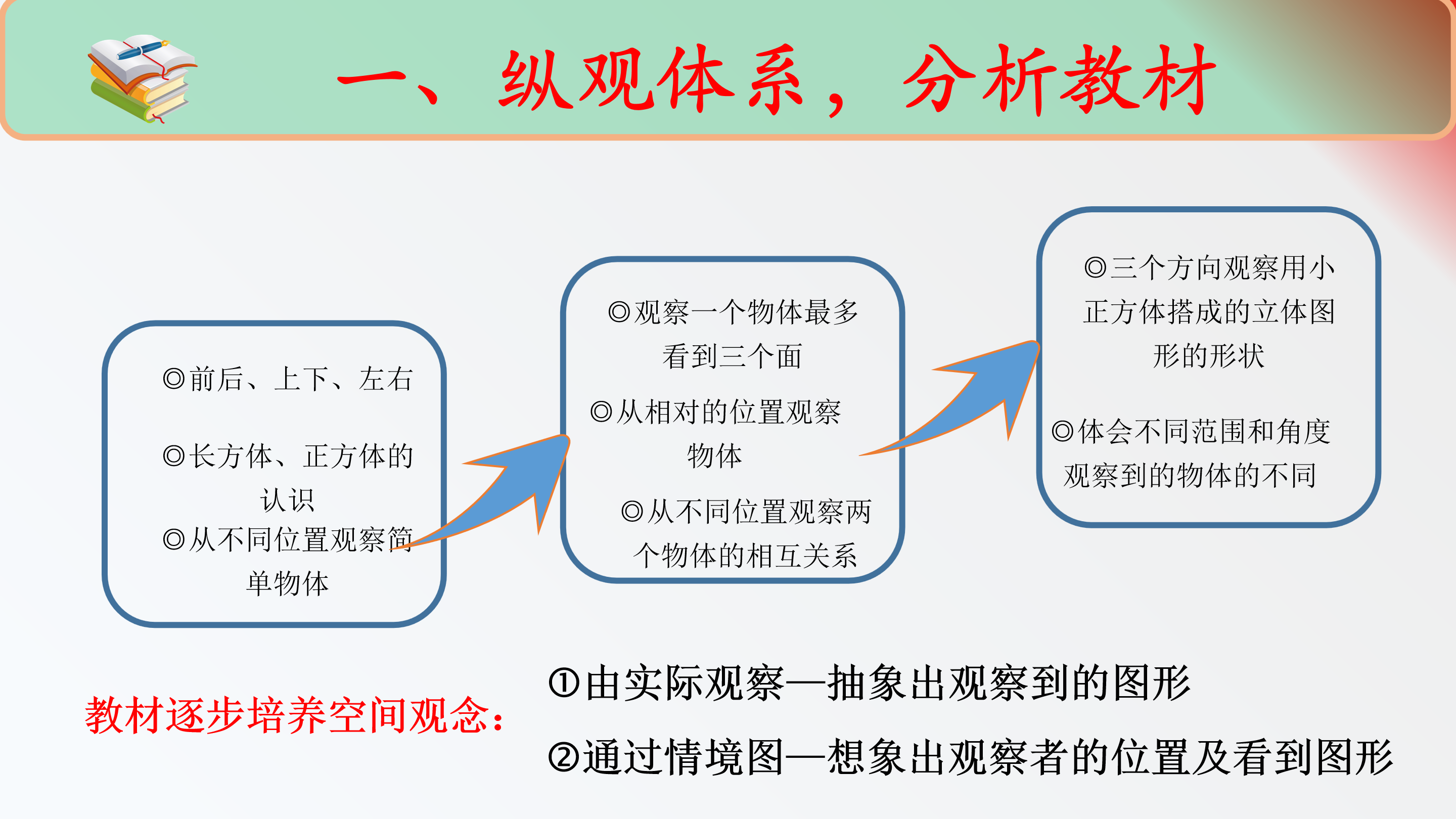 本节课属于 “图形与几何” 领域 “观察物体” 中的内容,主要在一年级下册初步学习从不同位置观察一个简单物体的基础上,拓展到观察一个物体最多可以看到三个面,从相对位置观察物体以及从不同位置观察两个物体的相互关系,进一步积累观察物体的直接经验,培养空间想象能力,初步发展学生的空降观念。