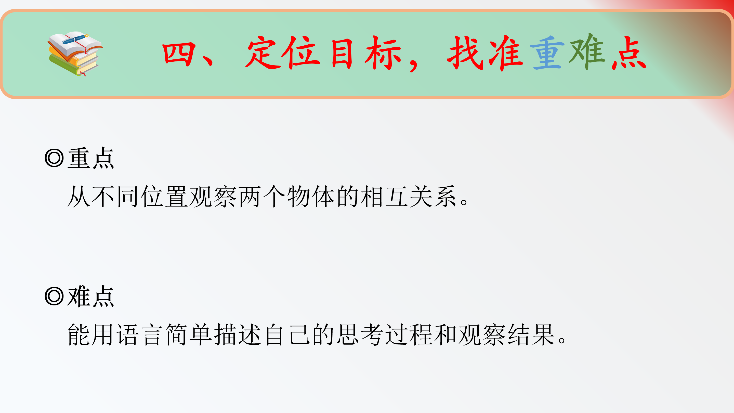 3. 积极主动参与观察活动,通过观察,体验站在不同的位置观察物体看到的形状不一样,进一步激发学生学习数学的兴趣,初步发展空间观念。