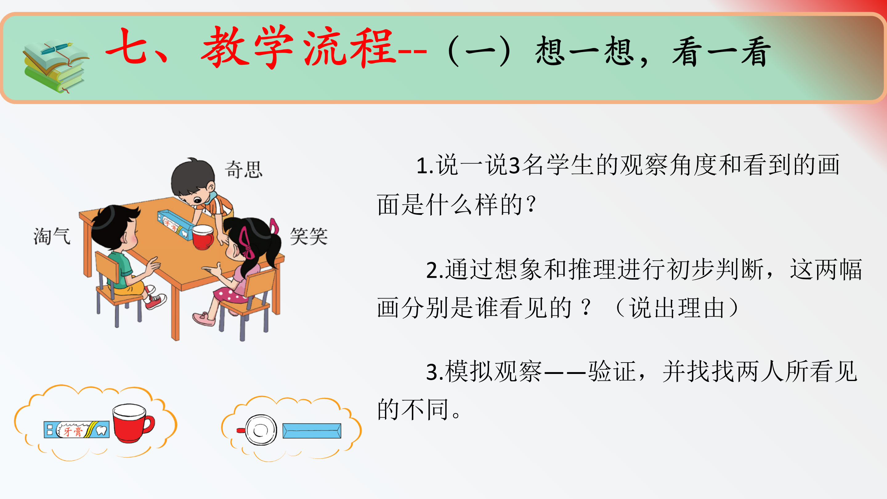 在一年级下册学习了从不同位置观察简单物体。对于观察物体已经有了一定的基础,这节《看一看》学生将通过对物体的观察、想象、猜想、验证等活动,初步发展合情推理能力及空间想象力,形成了初步的空间观念形。同时在与他人合作交流的活动中,能清楚的表达自己的思考过程和结果,体验观察和想象的乐趣,积累观察物体的活动经验。