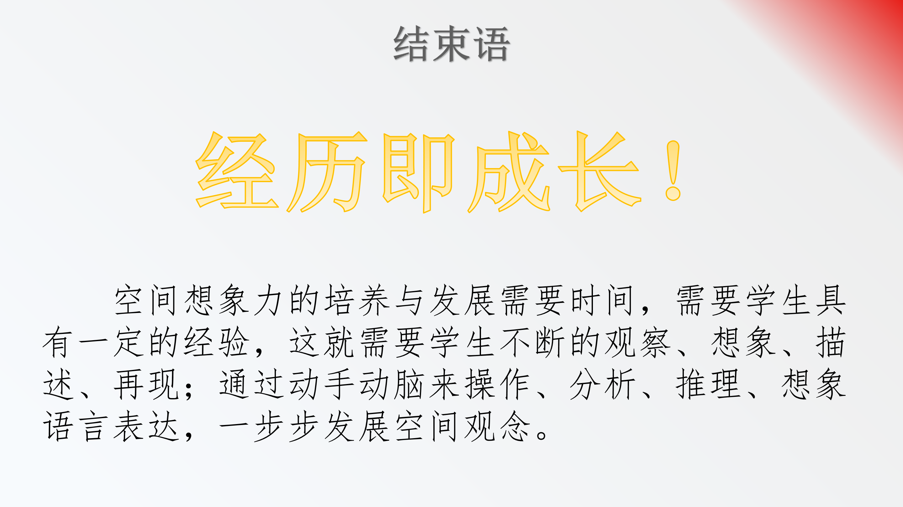 杜老师空间观念的外显,是一个非常好的提法。真有数学思想!孩子的空间观念是不是形成了?我们老师是观察不到的。他外显出来、说出来、表达出来,老师才了解孩子是不是形成了空间观念。这种提法非常值得我学习。