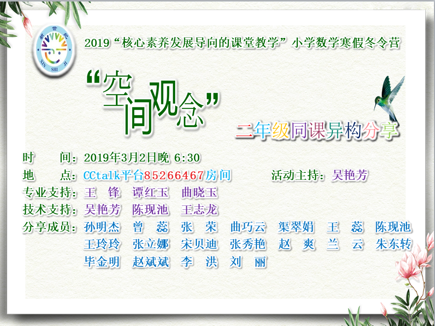 请各位报名参加二年级悦读活动的老师尽快加入到 “2019 二年级 空间观念 寒假悦读” CCtalk 群,群号: 85266467