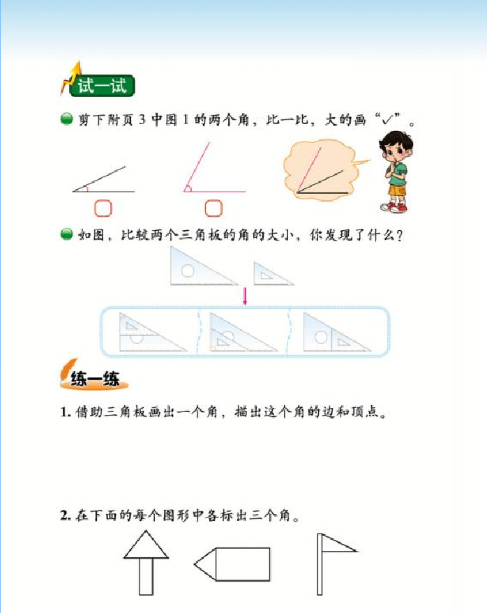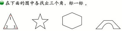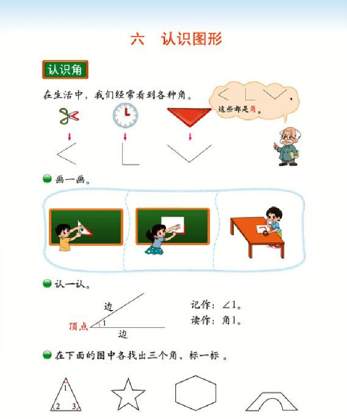 3. 通过观察、交流等活动,能在平面图形中辨认角。